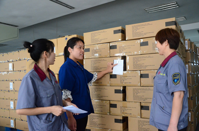 圖為服裝車間計劃管理員陳燕紅(中)在與質(zhì)量部質(zhì)檢人員一起,對接即將發(fā)出的出口產(chǎn)品。