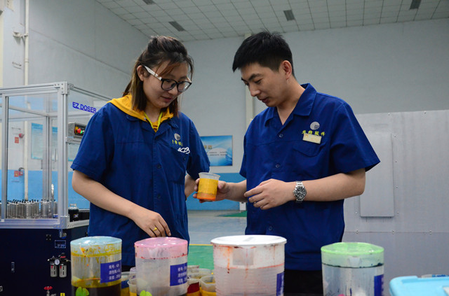 張?zhí)鹛穑▓D左)和張新華(圖右)二人,是多年來在公司花布車間從事專業(yè)技術(shù)工作的基層科技工作者,他們每天都為車間生產(chǎn)的印花產(chǎn)品精心調(diào)制著顏色。與其二人一樣,公司從事顏色調(diào)配的專業(yè)技術(shù)人員,每天都要完成一定數(shù)量的顏色調(diào)制;以花布車間為例,每人每天完成顏色調(diào)制在15-30個(gè)之間,并符合四級(jí)以上印花符樣標(biāo)準(zhǔn)。他們用自己的堅(jiān)守與付出,演繹著一道旖旎多彩的風(fēng)景線。