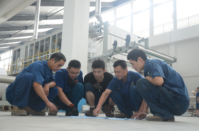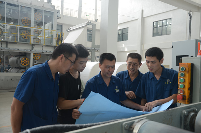 圖為家紡車間機(jī)電維修人員正在生產(chǎn)現(xiàn)場,對照設(shè)備圖紙進(jìn)行現(xiàn)場培訓(xùn)和討論。