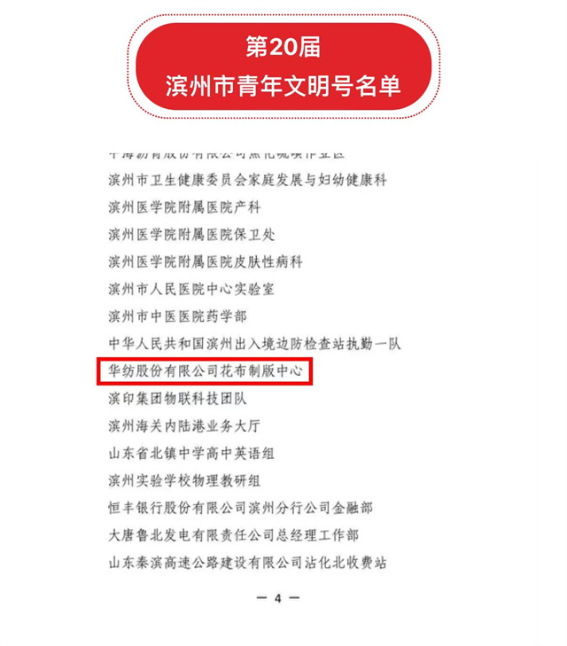 導(dǎo)讀:11月8日,濱州市創(chuàng)建青年文明號活動(dòng)組委會發(fā)布《關(guān)于命名第20屆“濱州市青年文明號”的決定》,經(jīng)逐級認(rèn)定、嚴(yán)格審核、社會公示,公司花布制版中心獲第20屆“濱州市青年文明號”