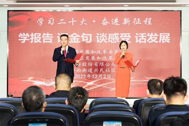 為持續深入學習領會、全面準確把握黨的二十大精神,12月2日,濱州市發展改革委聯合濱城區發展和改革局、華紡股份有限公司、市西街道興民社區舉辦“學習二十大·奮進新征程·學報告、誦金句、談感受、話發展”活動。團市委副書記丁寶冬、華紡股份有限公司黨委委員、人力行政總監孫玉濤出席活動。市發展改革委、濱城區發展和改革局、華紡股份有限公司、興民社區黨員代表參加活動。
