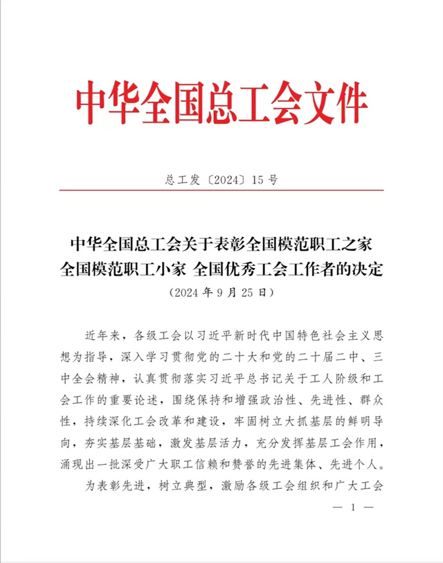 近日,中華全國總工會印發《中華全國總工會關于表彰全國模范職工之家、全國模范職工小家、全國優秀工會工作者的決定》,公司工會委員會榮獲“全國模范職工之家”榮譽稱號。