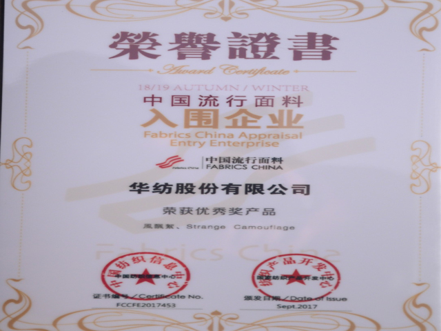 在參評的設計作品方面,由公司員工席亞偉設計開發(fā)的“風飄絮”、孟鑫設計的“Strange Camouflage”產(chǎn)品,榮獲“2018/2019秋冬中國流行面料入圍評審優(yōu)秀獎”;孟鑫設計的“唯美倩影”作品,榮獲“2017第二屆中國生態(tài)環(huán)保面料設計大賽優(yōu)秀獎”。