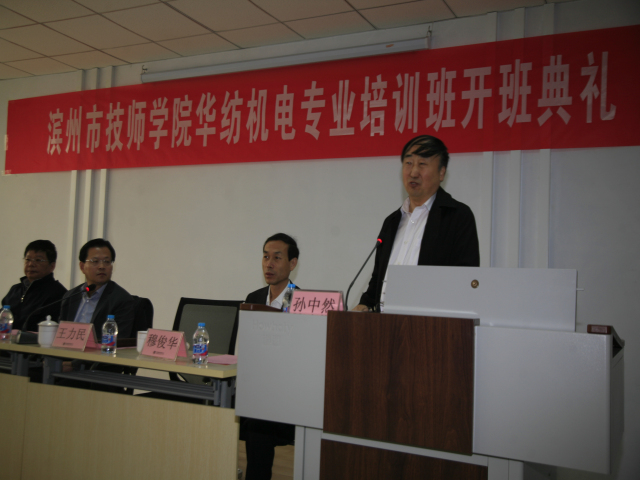 4月3日,公司與濱州市技師學院在公司工程技術研究院舉行“華紡機電專業培訓班開班典禮”。開班典禮在莊嚴的國歌聲中開始,濱州市技師學院黨委副書記、院長丁愛軍,黨委委員、副院長穆俊華,公司黨委書記、董事長王力民,總工程師羅維新在主席臺就坐,并為學員代表授書,丁愛軍和王力民分別發表講話。