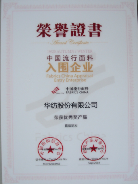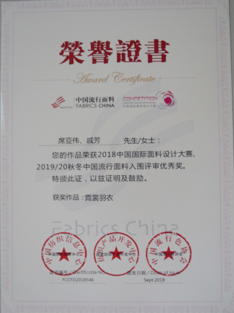 日前,公司在2018年中國國際面料設計大賽、第40屆(2019/20秋冬)中國流行面料入圍評審中再獲佳績,被授予“2019/20秋冬流行面料入圍企業”稱號,由席亞偉、戚芳設計的“霓裳羽衣”面料產品榮獲大賽優秀獎。